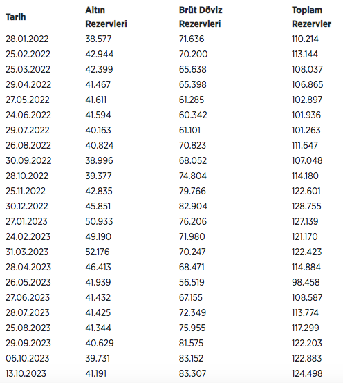 TCMB rezervleri tarihler itibarıyla şöyle (milyon dolar):