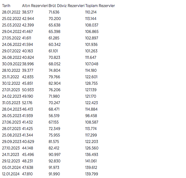 TCMB rezervleri tarihler itibarıyla şöyle (milyon dolar):