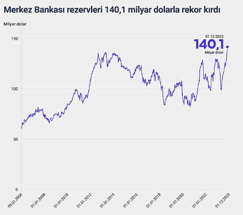 Merkez Bankası'nın toplam rezervleri, 1 Aralık haftasında bir önceki haftaya göre 3 milyar 656 milyon dolar yükselişle 136 milyar 493 milyon dolardan 140 milyar 149 milyon dolarla tüm zamanların en yüksek seviyesine ulaştı.