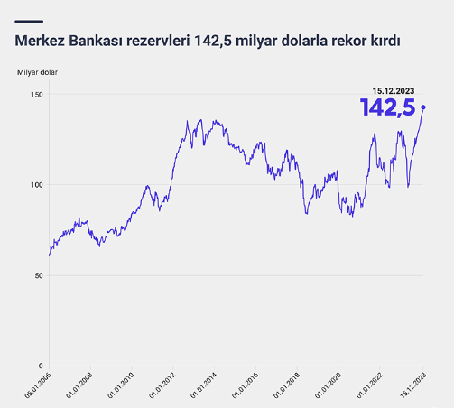 Böylece Merkez Bankasının toplam rezervleri, 15 Aralık haftasında bir önceki haftaya göre 1 milyar 154 milyon dolar yükselişle 141 milyar 374 milyon dolardan 142 milyar 528 milyon dolarla tüm zamanların en yüksek seviyesine ulaştı.