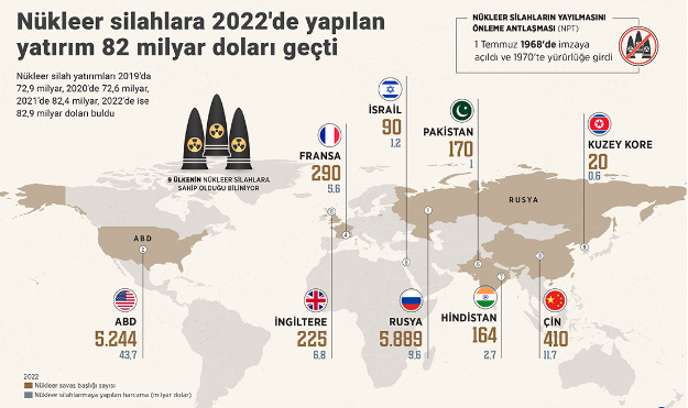 Verilere göre, dünya genelinde nükleer silah yatırımları 2019'da 72,9 milyar dolar, 2020'de 72,6 milyar dolar, 2021'de 82,4 milyar dolar, 2022'de ise 82,9 milyar doları buldu. 4 yıl içerisinde yatırımların 10 milyar dolar artması dikkati çekti.