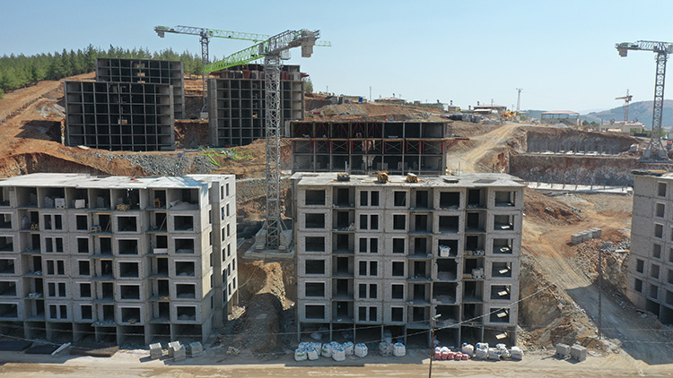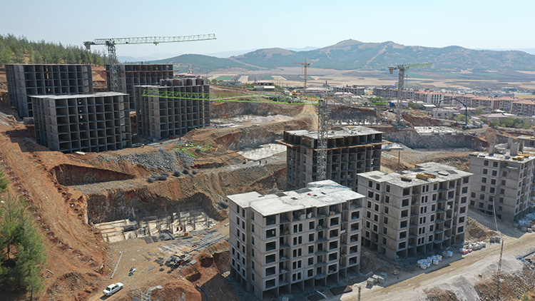 Kahramanmaraş merkezli 6 Şubat'taki depremlerden etkilenen Gaziantep'in Nurdağı ilçesinde, Toplu Konut İdaresince (TOKİ) yapımı devam eden kalıcı konutların inşası 24 saat esasına göre sürdürülüyor.