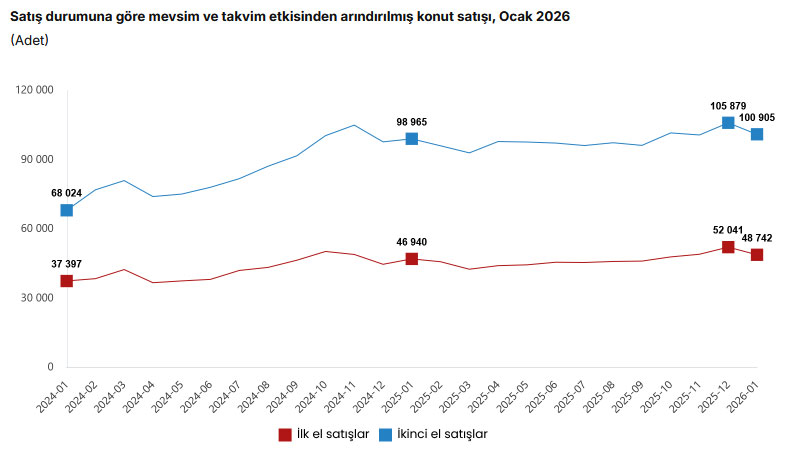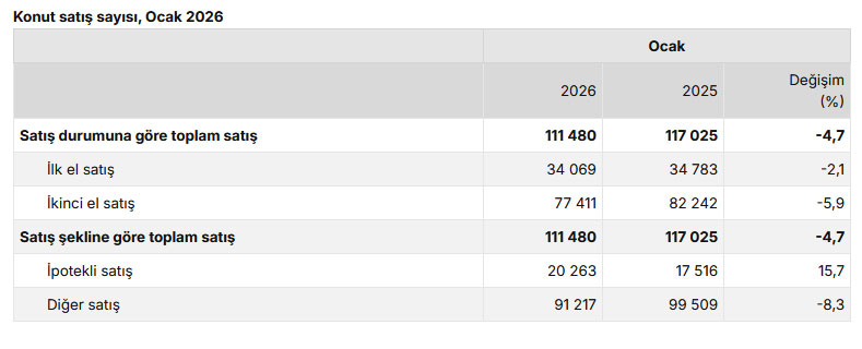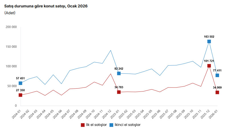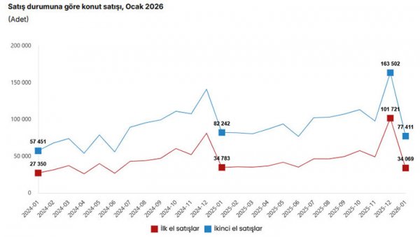 Türkiye genelinde 2026'nın ilk ayında ilk el konut satışları 34 bin 69, ikinci el konut satışları 77 bin 411 olarak gerçekleşti.