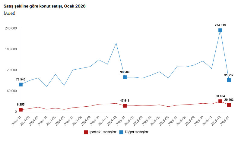 Türkiye genelinde ipotekli konut satışları Ocak ayında bir önceki yılın aynı ayına göre %15,7 oranında artarak 20 bin 263 oldu. Diğer konut satışları ise Ocak ayında bir önceki yılın aynı ayına göre %8,3 oranında azalarak 91 bin 217 oldu. Toplam konut satışları içinde ipotekli satışların payı %18,2, diğer satışların payı %81,8 olarak gerçekleşti.