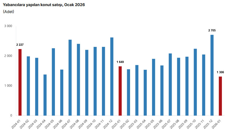 Yabancılara yapılan konut satışları Ocak ayında bir önceki yılın aynı ayına göre %20,8 oranında azalarak bin 306 oldu. Ocak ayında toplam konut satışları içinde yabancılara yapılan konut satışının payı %1,2 olarak gerçekleşti.