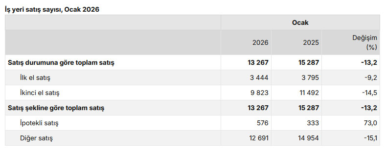 Türkiye genelinde ipotekli iş yeri satışları Ocak ayında bir önceki yılın aynı ayına göre %73,0 oranında artarak 576 oldu. Diğer iş yeri satışları ise Ocak ayında bir önceki yılın aynı ayına göre %15,1 oranında azalarak 12 bin 691 oldu.
