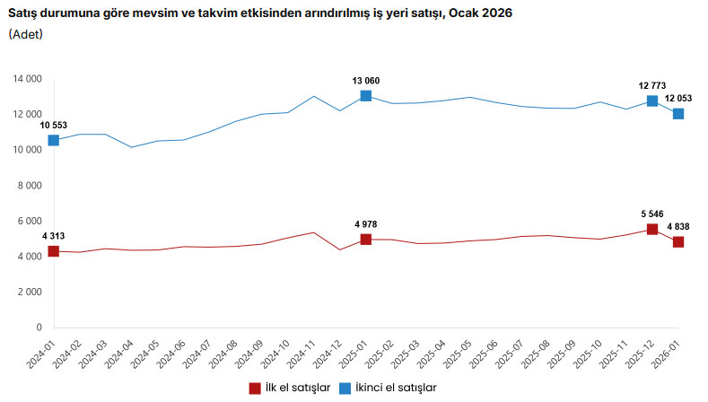 Türkiye genelinde ilk el iş yeri satışları Ocak ayında bir önceki yılın aynı ayına göre %9,2 oranında azalarak 3 bin 444 oldu. İkinci el iş yeri satışları ise Ocak ayında bir önceki yılın aynı ayına göre %14,5 oranında azalarak 9 bin 823 oldu.