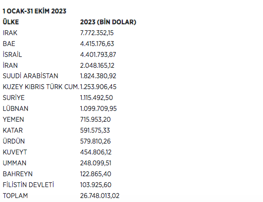 TİM verilerine göre, 2023 Ocak-Ekim döneminde Orta Doğu ve Körfez ülkelerine gerçekleştirilen ihracat miktarı (bin dolar) şöyle: