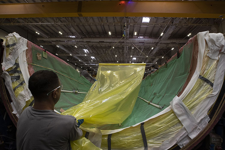 Kanatlar iki kabuk halinde üretiliyor. Kabuk kalıpları, kanadın uzunluğuna göre 60 ya da 80 metrelik olabiliyor. Kalıplara kumaşlar seriliyor ve reçine ile tutturuluyor. Kabukların noktasına göre serilen kumaş miktarı değişiyor, kimi yerde dört kat kimi yerde yüz kattan fazla kumaş seriliyor.