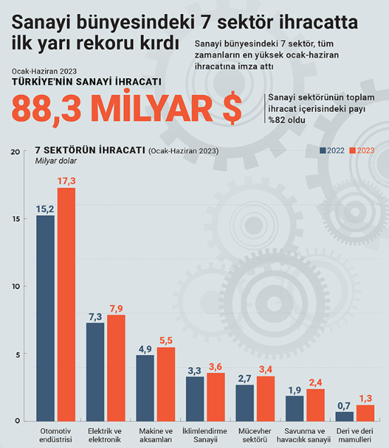 Deri ve deri mamulleri, otomotiv endüstrisi, elektrik ve elektronik, makine ve aksamları, mücevher, savunma ve havacılık sanayii ile iklimlendirme sanayii tüm zamanların en yüksek ocak-haziran ihracatını gerçekleştirdi.