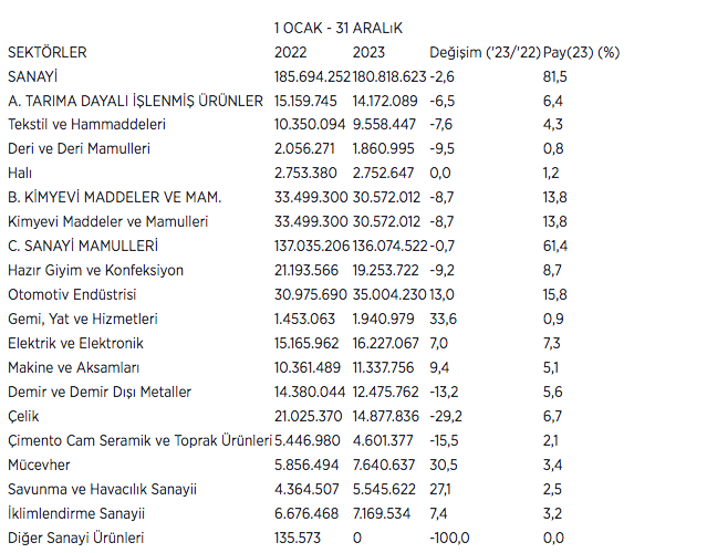 TİM verilerine göre, geçen yıl ve 2022'de sanayi ve sanayiye bağlı sektörlerin ihracatı şöyle: