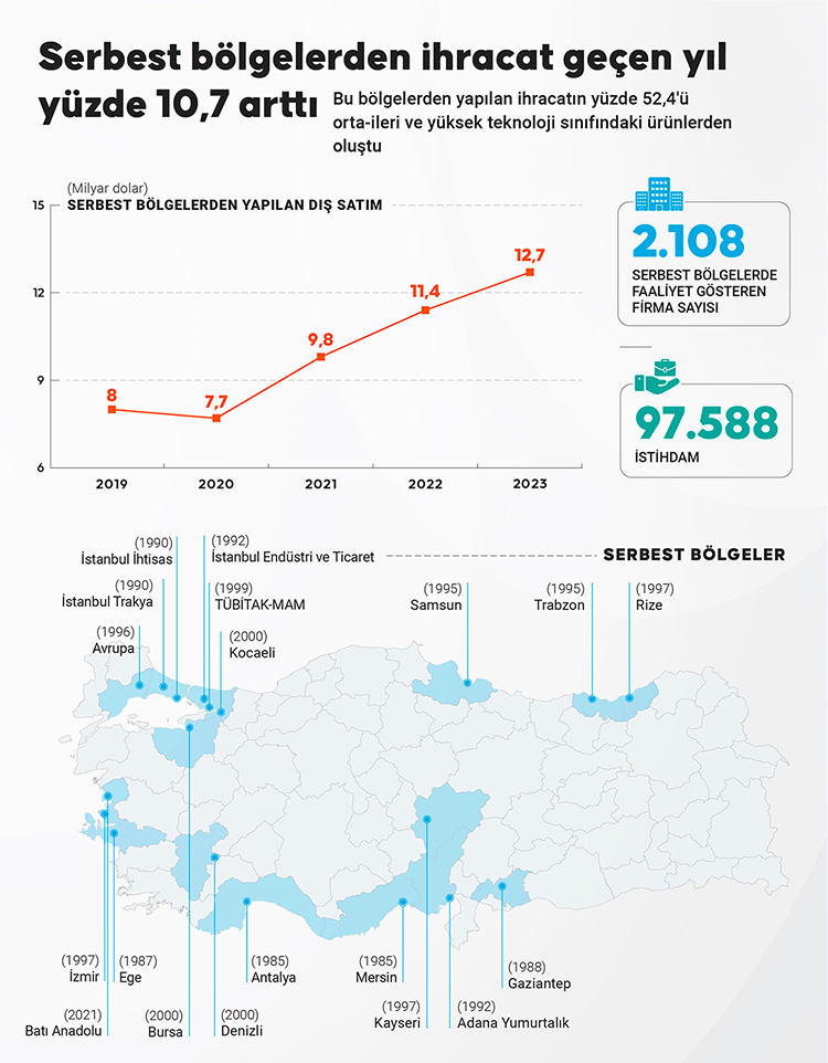 Ticaret Bakanlığından yapılan yazılı açıklamaya göre, serbest bölgelerden 2022'de 11,4 milyar dolar olarak gerçekleşen ihracat, geçen yıl yüzde 10,7 yükselişle 12,7 milyar dolara çıktı. Bu bölgelerden yapılan ihracatın tutarı 2021 yılında 9,8 milyar dolar, 2020'de 7,7 milyar dolar, 2019'da ise 8 milyar dolar olarak hesaplanmıştı.