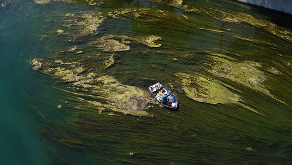 Suyun kesilmesinin ardından yosunların nehrin yüzeyine yayıldığı görüldü.
