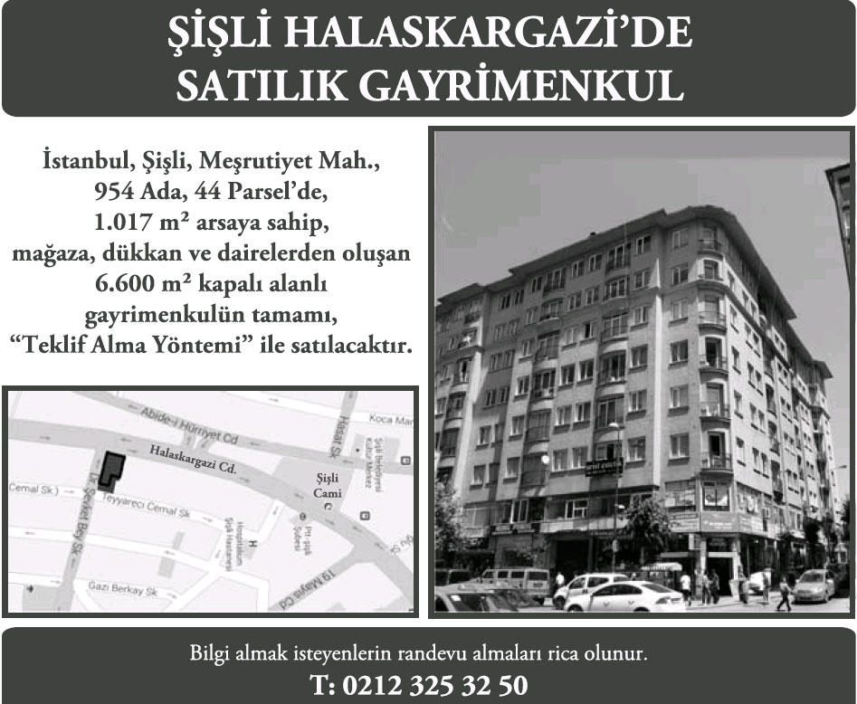 İstanbul, Şişli, Meşrutiyet Mahallesi, 954 Ada, 44 Parsel'de bulunan 1.017 metrekare arsaya sahip, mağaza, dükkan ve dairelerden oluşan 6 bin 600 metrekare kapalı alanlı gayrimenkulün tamamı teklif alma yöntemi ile satılacak.