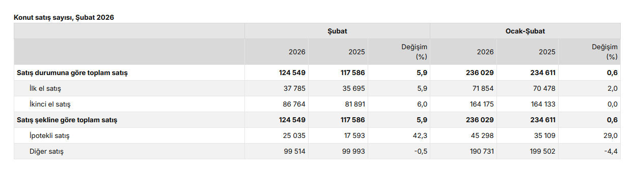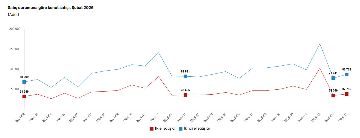 Türkiye genelinde ilk el konut satış sayısı Şubat ayında bir önceki yılın aynı ayına göre %5,9 oranında artarak 37 bin 785 oldu. İkinci el konut satışları ise Şubat ayında bir önceki yılın aynı ayına göre %6,0 oranında artarak 86 bin 764 oldu. Toplam konut satışları içinde ilk el konut satışlarının payı %30,3, ikinci el konut satışlarının payı %69,7 oldu.