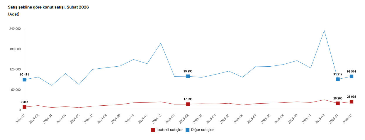 Türkiye genelinde ipotekli konut satışları Şubat ayında bir önceki yılın aynı ayına göre %42,3 oranında artarak 25 bin 35 oldu. Diğer konut satışları ise Şubat ayında bir önceki yılın aynı ayına göre %0,5 oranında azalarak 99 bin 514 oldu. Toplam konut satışları içinde ipotekli satışların payı %20,1 diğer satışların payı %79,9 olarak gerçekleşti.