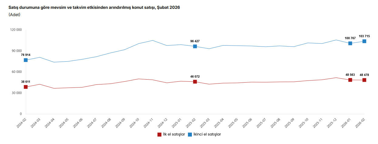 Takvim etkilerinden arındırılmış serilerde, bir önceki yılın aynı ayına göre ilk el konut satışları %5,8 arttı; ikinci el konut satışları %5,9 arttı. Mevsim ve takvim etkilerinden arındırılmış serilerde ise bir önceki aya göre ilk el konut satışları %0,2 azaldı; ikinci el konut satışları %2,9 arttı.