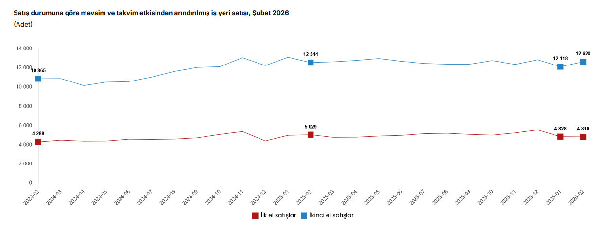 Türkiye genelinde ilk el iş yeri satış sayısı Şubat ayında bir önceki yılın aynı ayına göre %5,2 oranında azalarak 3 bin 981 oldu. İkinci el iş yeri satışları ise Şubat ayında bir önceki yılın aynı ayına göre %0,4 oranında artarak 11 bin 88 oldu.
