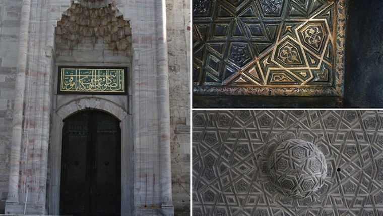 Ersoy, caminin revaklı avlusuna 3 yönden bronz kapılarla girildiğini, bu kapıların geometrik geçmeleri dışında, ajurlu demir menteşe klapalarının bile kazıma tekniğiyle işlendiğini, kapılarda rumi desenlere yer verildiğini aktardı.