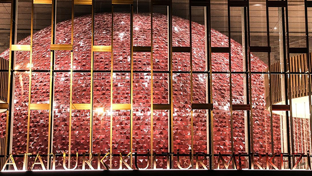 Taksim'de, yapımında sona gelinen Atatürk Kültür Merkezi'nin (AKM) yeni tabelası asıldı.