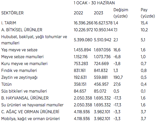 TİM verilerine göre, bu yıl ve 2022'nin ocak-haziran döneminde tarım ve tarıma bağlı sektörlerin ihracatı (dolar) şöyle: