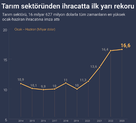 Türkiye İhracatçılar Meclisi (TİM) verilerine öre, Türkiye'nin tarım sektörü, 16 milyar 627 milyon dolarla tüm zamanların en yüksek ilk yarı ihracatına imza attı.