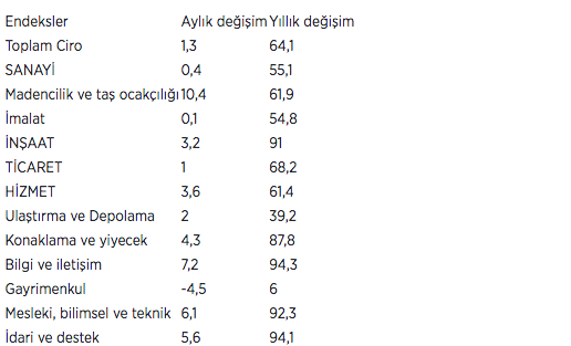 Buna göre, sanayi, inşaat, ticaret ve hizmet sektörleri toplamında ciro endeksi eylülde yıllık bazda yüzde 64,1 yükseldi. Toplam cironun alt detaylarına bakıldığında eylülde yıllık sanayi sektörü ciro endeksi yüzde 55,1, inşaat ciro endeksi yüzde 91, ticaret ciro endeksi yüzde 68,2, hizmet ciro endeksi yüzde 61,4 artış kaydetti.
