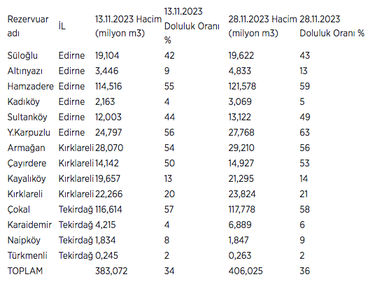 Barajların 13 Kasım-28 Kasım 2023 doluluk oranları şu şekilde: