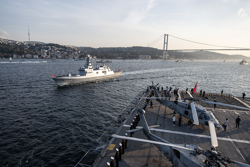 İstanbul Boğazı’nda güneyden kuzeye doğru yapılan resmigeçitte Deniz Kuvvetleri Komutanlığınca henüz teslim alınmayan ama bayrak çekilen Türkiye'nin ilk milli fırkateyni TCG İstanbul ile Pirireis denizaltısı, denizde ikmal muharebe destek gemisi Derya da yer aldı.