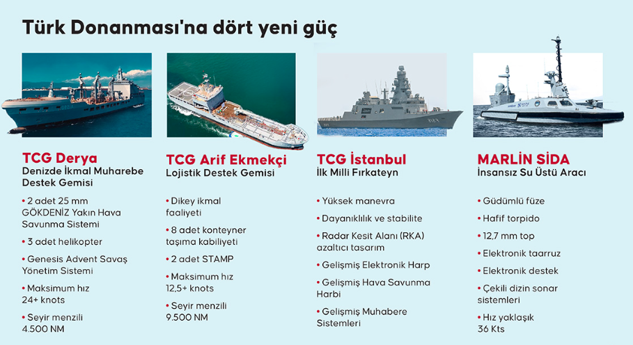 Törende TCG Derya, TCG İstanbul, TCG Üsteğmen Arif Ekmekçi ve Marlin SİDA, Türk donanmasına teslim ediliyor. Her biri farklı görevlerde kullanılacak bu platformlar, Türk Deniz Kuvvetlerinin Mavi Vatan’daki gücüne güç katacak.