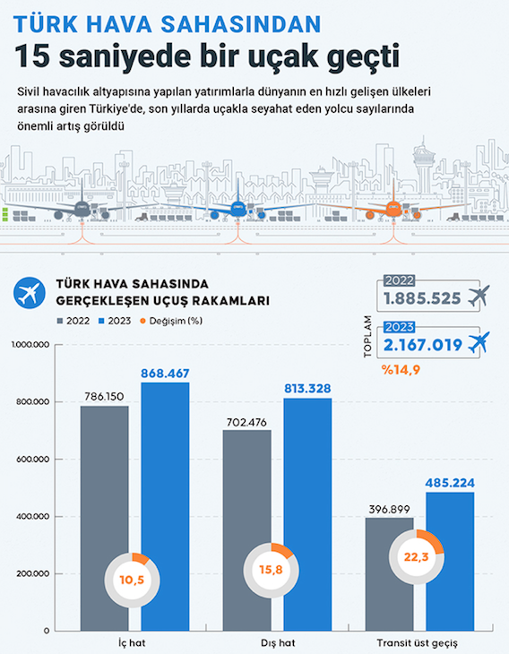 Türk hava sahasında geçen yıl gerçekleşen transit üst geçişler dahil uçuş sayısı, bir önceki yıla göre yüzde 14,9 artış göstererek 1 milyon 885 bin 525'ten 2 milyon 167 bin 19'a yükseldi. Söz konusu dönemde Türkiye semalarından yaklaşık her 15 saniyede bir uçak geçti.