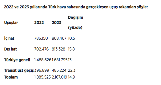 Türk hava sahasından transit üst geçiş sayısı ise yüzde 22,3 arttı ve 2023'te 485 bin 224 olarak gerçekleşti. Böylece Türk hava sahası toplam 2 milyon 167 bin 19 uçuşa ev sahipliği yapmış oldu.