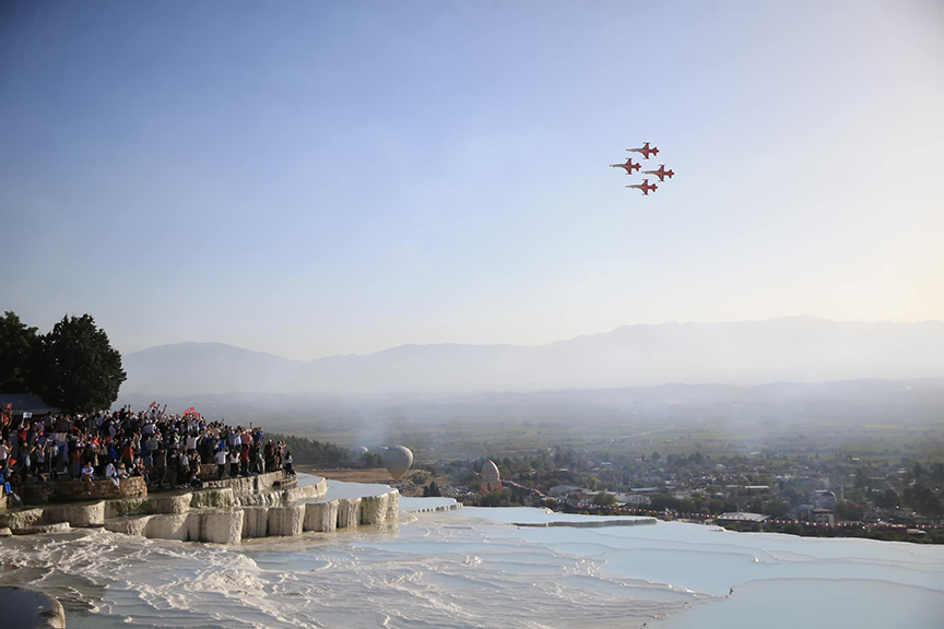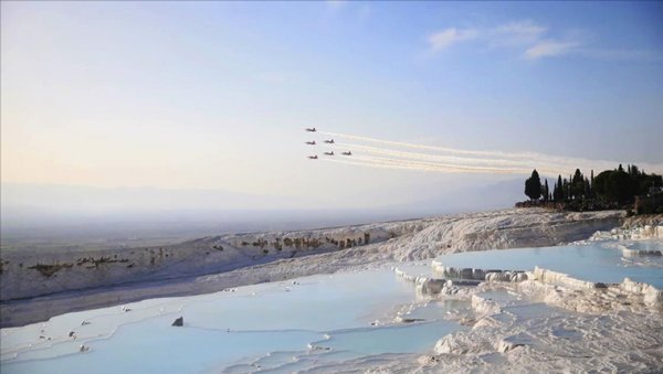 Türk Hava Kuvvetlerinin akrobasi timi Türk Yıldızları, UNESCO Dünya Mirası Listesi'ndeki Pamukkale'de gösteri uçuşu gerçekleştirdi.