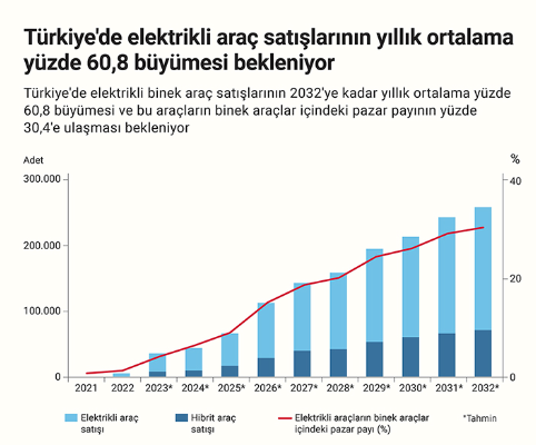 Elektrikli araçlardaki yıllık öngörülen yüzde 60,8 büyümeyle 2032'de Türkiye'de toplam elektrikli binek araç sayısının 259 bin 500 ve pazar payının yüzde 30,4'e ulaşacağı öngörülüyor.