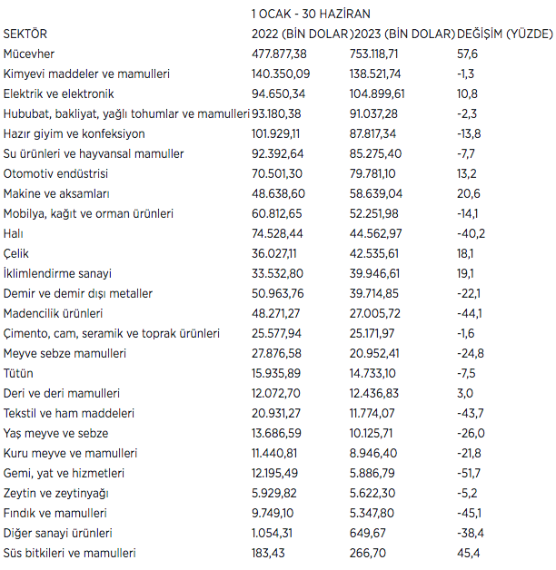TİM verilerine göre, ocak-haziran döneminde sektörlerin BAE'ye ihracatı şöyle: