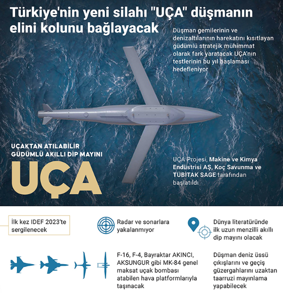 Türk savunma sanayisindeki yeteneklerin birleştirilmesiyle ortaya çıkan Uçaktan Atılabilir Güdümlü Akıllı Dip Mayını UÇA, muharebe sahasında düşman üzerinde "sürpriz etkisi" yaratacak.