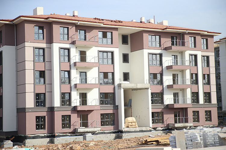 İlçenin çeşitli noktalarında mart ayında temeli atılan 8 bin 799 deprem konutundan 2 bine yakınının kaba inşaatı bitti.