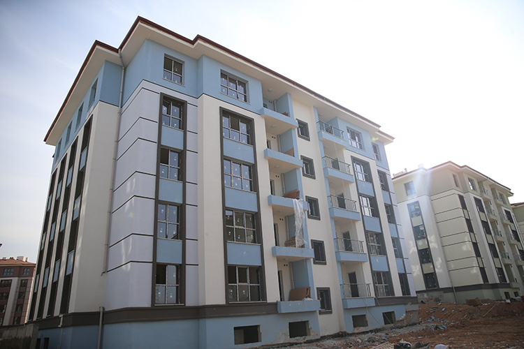 Dış cephe işlemleri, kapı, pencere ve mutfak dolapları takılmaya başlanan afet konutları, çevre düzenlemesinin ardından yıl sonuna kadar hak sahiplerine teslim edilecek.