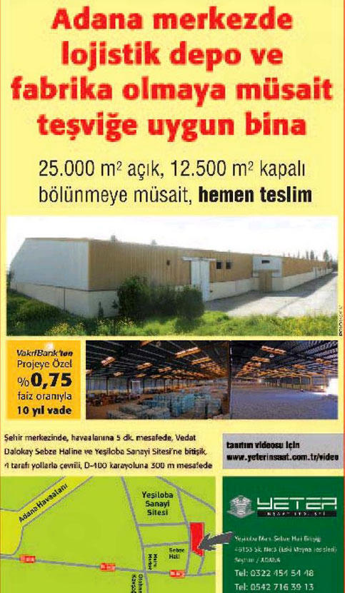 Yeter İnşaat, Adana Merkez'de lojistik depo ve fabrika olmaya müsait teşviğe uygun binayı satışa çıkardı. 25 bin metrekare açık, 12 bin 500 metrekare kapalı bölünmeye müsait olan bina için Vakıfbank'tan yüzde 0,75 faiz oranıyla 10 yıl vade yapılıyor.