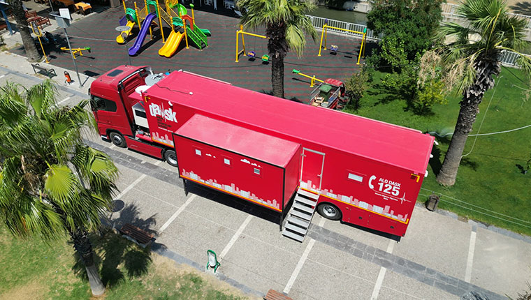 DASK'ın yüksek teknolojik altyapı ile donattığı DASK Tırı, deprem afeti yaşanması halinde hızla ilgili bölgeye intikal edebilen mobil sigorta ofisi olarak sigortalılara afet yerinde destek verebiliyor.