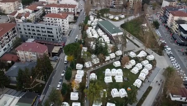 Düzce'de depremin ardından evleri hasar gören ve konutlarına girmeye çekinen vatandaşların konaklamaları için kurulan çadırlar havadan görüntülendi.