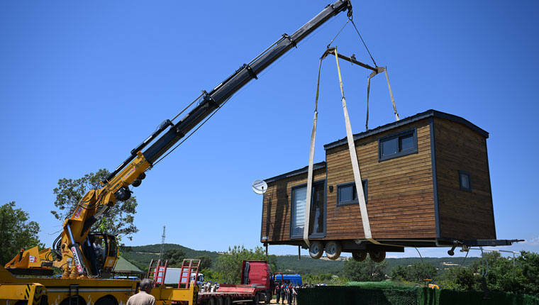 Vinç yardımıyla yerinden alınarak tırlara yüklenen "tiny house"lar, sahiplerinin teslim alması için Koruklu köyünde belirlenen alana götürüldü.