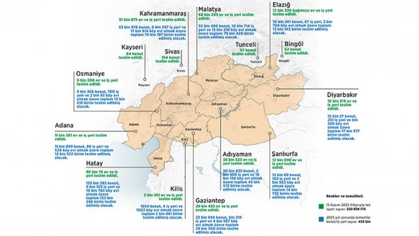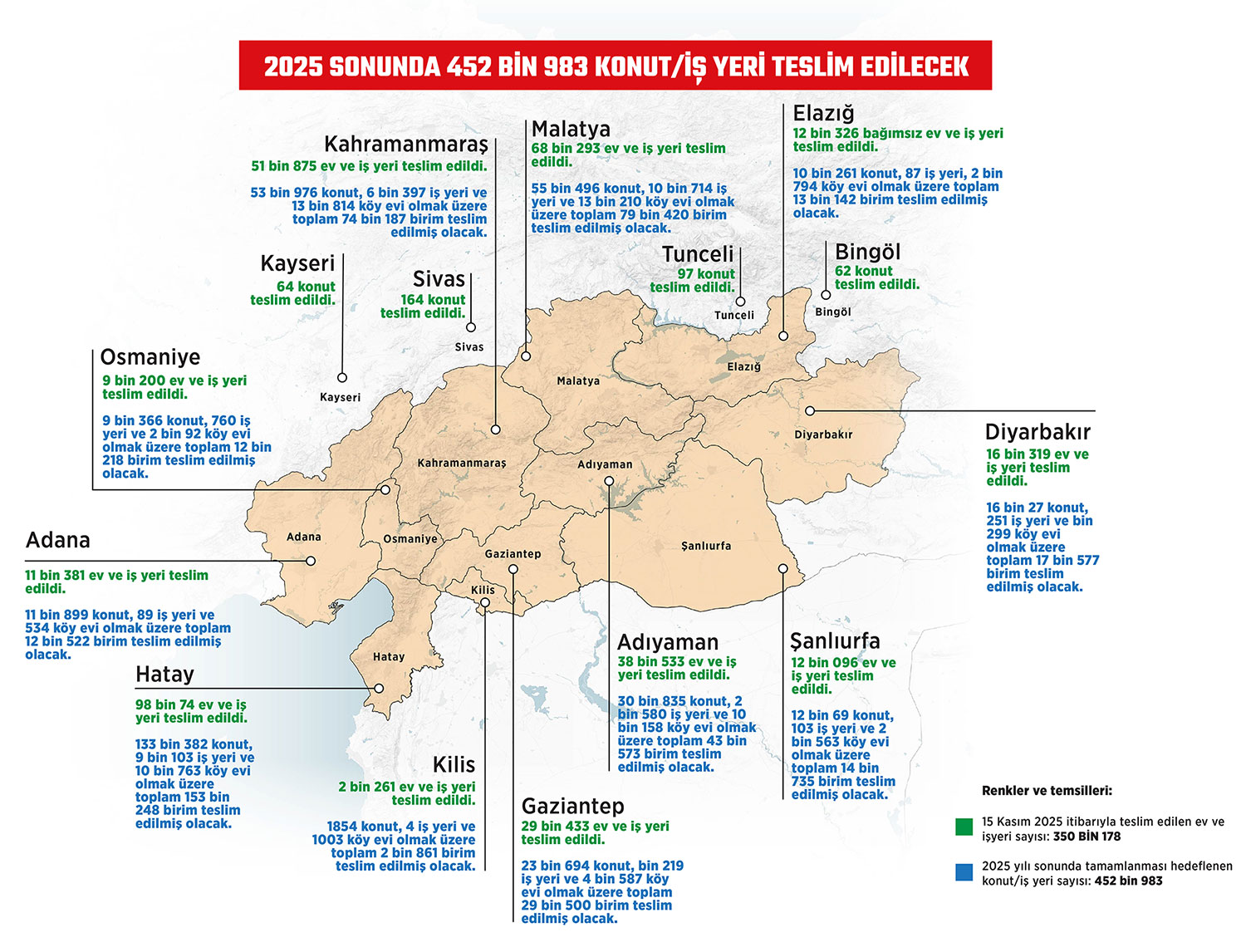 Kahramanmaraş: 36 bin 17 konut, 2226 iş yeri ve 13 bin 632 köy evi olmak üzere toplam 51 bin 875 bağımsız bölüm inşa edildi. Yıl sonuna kadar 53 bin 976 konut, 6 bin 397 iş yeri ve 13 bin 814 köy evi olmak üzere toplamda 74 bin 187 konut ve iş yerinin yapımı tamamlanmış olacak.