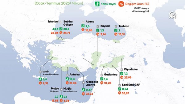 Bu yılın ilk 7 ayında turizm merkezlerinde bulunan havalimanlarında ağırlanan yolcu sayısı geçen yılın aynı dönemine göre yüzde 22 arttı