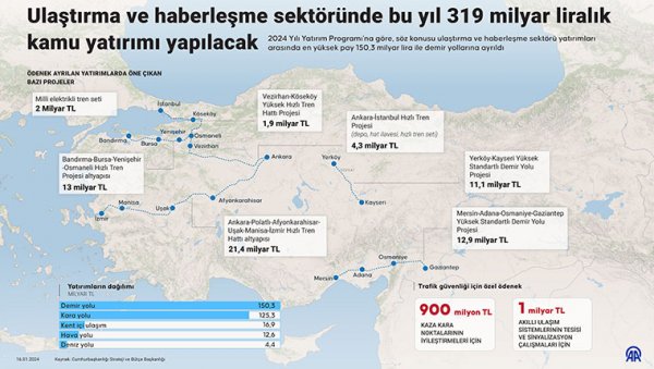 2024 Yılı Yatırım Programı'na göre, söz konusu ulaştırma ve haberleşme sektörü yatırımları arasında en yüksek pay 150,3 milyar lira ile demir yollarına ayrıldı.