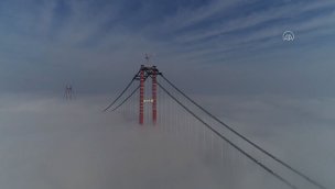 Çanakkale'nin Lapseki ve Gelibolu ilçeleri arasında yapımı devam eden "1915 Çanakkale Köprüsü" boğazda etkili olan sisin içinde drone ile görüntülendi ...