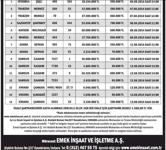 Türk gayrimenkul sektörünün dev şirketi Emek İnşaat portföyündeki binaları satışa çıkardı. İstanbul, Trabzon, Gaziantep, Kayseri, Manisa, Adana, Samsun ve Ankara'da bulunan 15 binanın toplam tahmini değeri 183 milyon 551 bin lira olarak belirlendi.