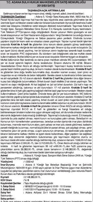 Pozantı İcra Dairesi'nin Yeni Konacık Köyü'nde satışa çıkardığı Pendosis Turistik Tatil Köyü ve boş arazilerden oluşan 8 gayrimenkulün toplam tahmini bedeli 21 milyon 961 bin 519 lira olarak belirlendi. Söz konusu 8 gayrimenkulün ihalesi 10 Haziran 2014 günü saat 11:00 ile 13:30 arası Pozantı Atatürk Kültür Merkezi'nde açık artırma yöntemiyle gerçekleşecek. Alıcı çıkmaması durumunda ikinci satış 7 Temmuz 2014 günü aynı yer ve saatte tekrarlanacak.