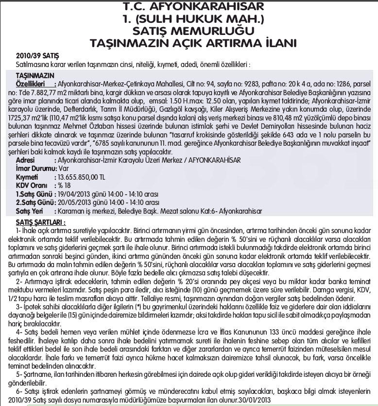 İhale, 19.04.2013 günü saat 14.00'te Karaman İş Merkezi, Belediye Başkanlığı Mezat Salonu Kat: 6 Afyonkarahisar adresinde yapılacak.