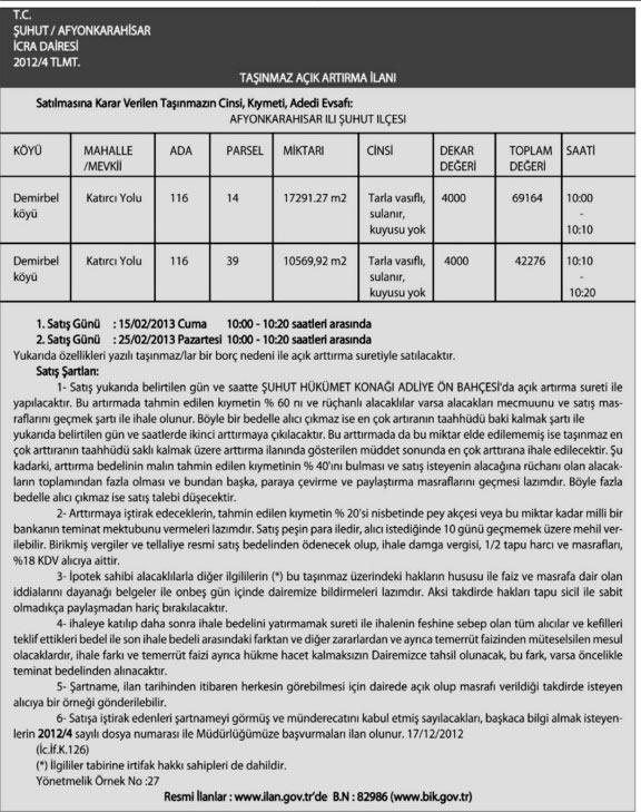 Toplam değerleri 69 bin 164 lira ve 42 bin 276 lira olan arazilerin ilk satışı 15 Şubat 2012 tarihinde. İkinci satışları ise 25 Şubat 2012 tarihinde saat 10.00'da Şuhut Hükümet Konağı Adliyesi'nin ön bahçesinde açık artırma ile satılacak.